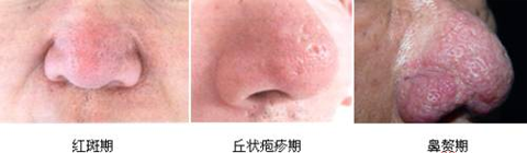 又称鼻赘期。仅见于少数患者,多发生40岁以上男性由于长期充血,反复感染,鼻部结缔组织增生,皮脂腺异常扩大,鼻端肥大,呈暗红色或紫红色。鼻部有扩大结节,表面凹凸不平,形成赘瘤状称为鼻赘。